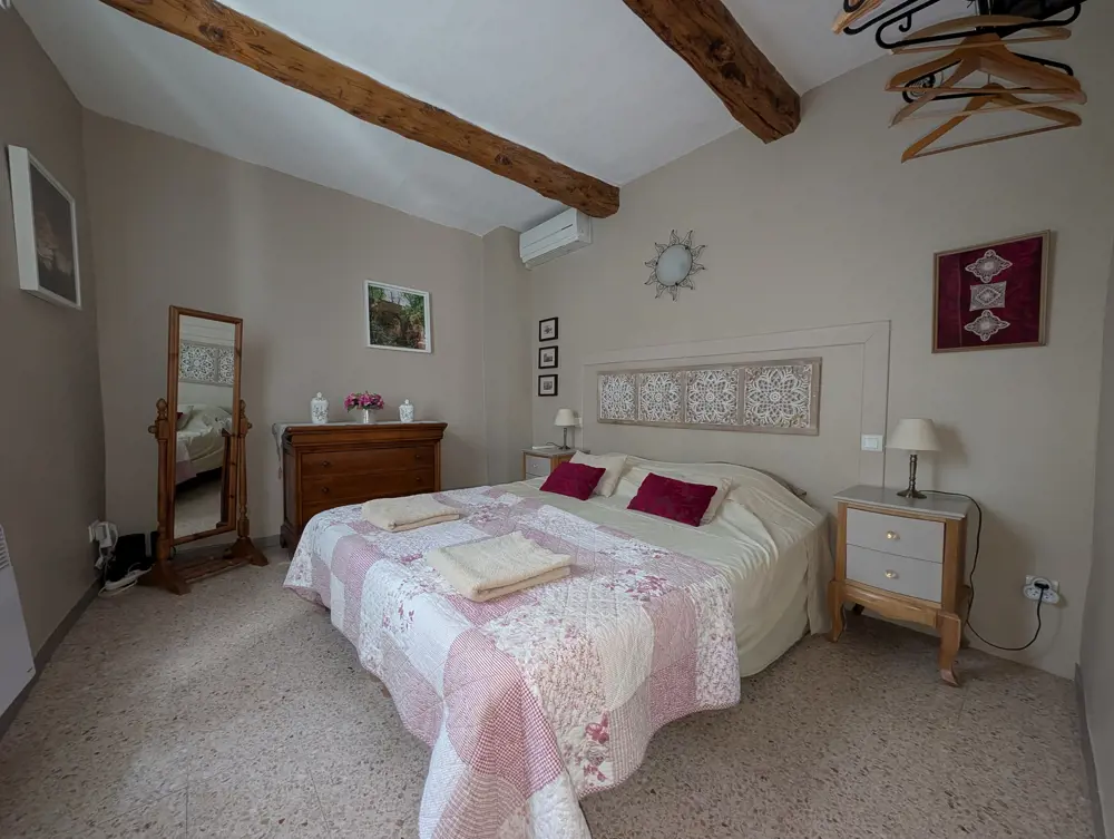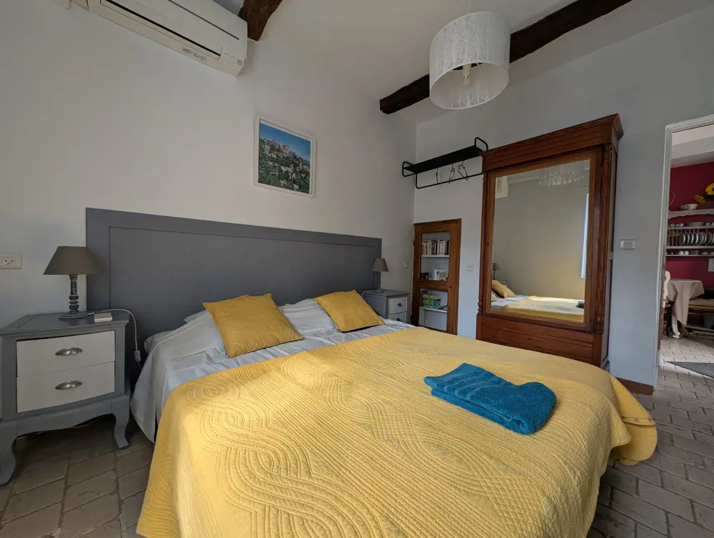 Au rez-de-chaussée, une chambre climatisée peut être aménagée selon vos envies : deux lits simples ou un grand lit double. Astuce insolite : la bibliothèque dissimule astucieusement la table à repasser et son fer.