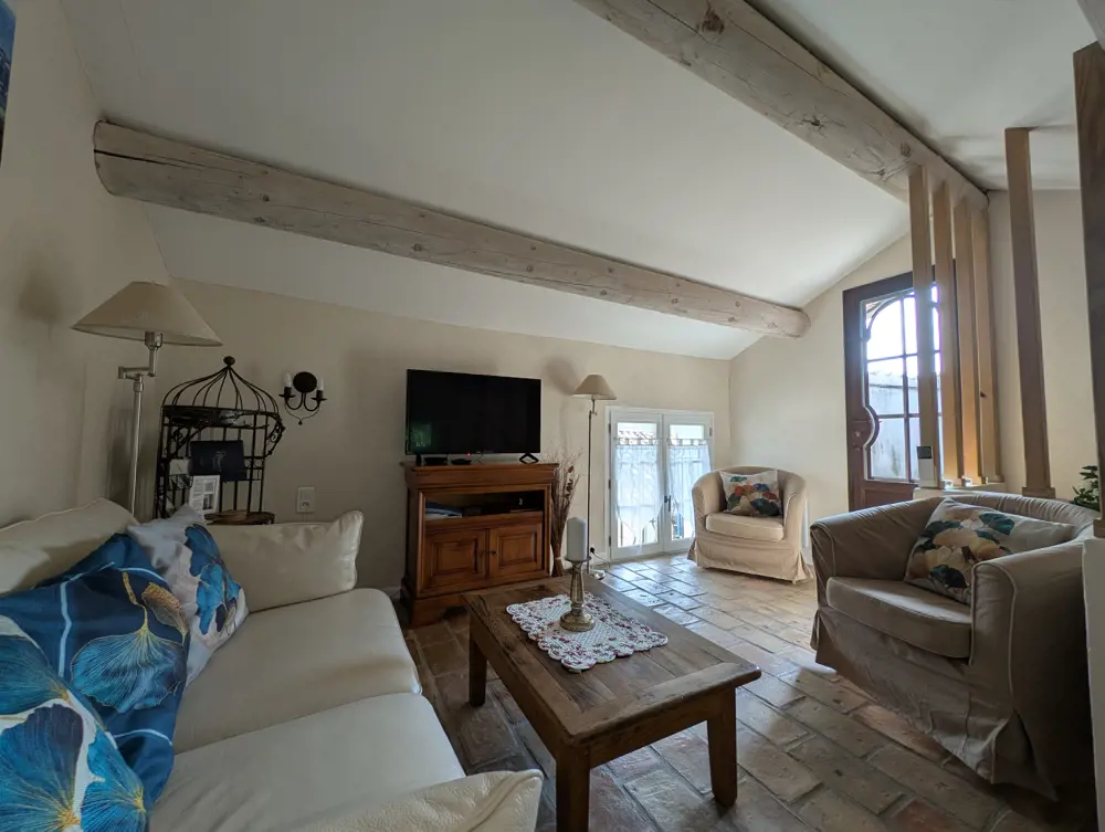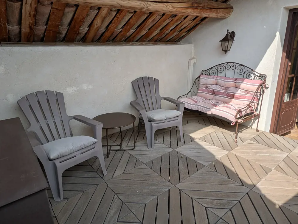 Au dernier étage, le salon, climatisé également, vous invite à la détente avec ses assises confortables et sa télévision. La cerise sur le gâteau ? Une superbe terrasse tropézienne, offrant une vue imprenable sur les toits de Sablet, l’église et les Dentelles de Montmirail. Protégée du Mistral, cette oasis perchée est parfaite pour lire, rêver ou simplement profiter du calme.